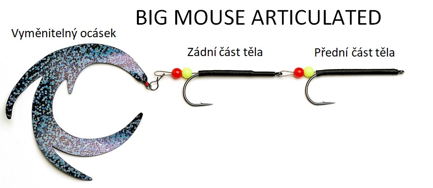 BIG MOUSE jsou naší novinkou roku 2022. Základním materiálem pro vázání těchto typů myší je dutá zimní srst srnce s provázanými dlouhými syntetickými vlákny. BIG MOUSE jsou z řady našich streamerů ARTICULATED tedy, dva háky velikosti 4/0 k sobě spojeny pevným lankem.