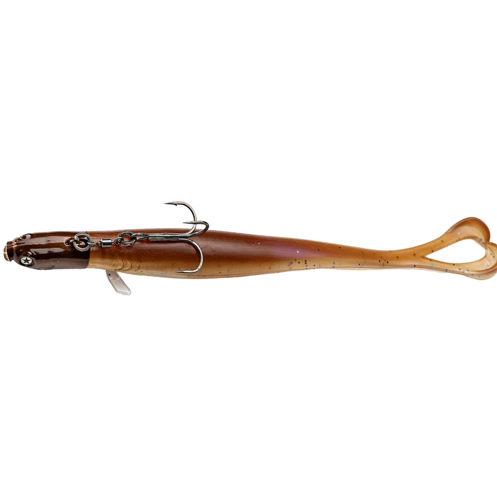 LMAB Drunk Shooter je skvělou kombinací pro pelagický rybolov, která se skládá ze speciální hlavy a extrémně chytlavé měkké nástrahy. 55g hlava je zúžená a akvadynamicky tvarovaná. To znamená, že se obzvláště rychle potopí a když dosáhne požadované hloubky, zůstane ve vodě dokonale vodorovně. Vlastnosti, které jsou u vertikální přívlače velmi důležité a často jsou rozhodující pro úlovek. Gumové tělo je připojeno k hlavě pomocí šroubovací spirálky o délce 2 cm, která bezpečně drží a je vybavena poutavými hvězdnými očky v designu Drunk Bait s hranolovým vzhledem pro další vizuální podněty. Teflonem potažený speciální trojháček velikosti 1/0 je opatřen 2 trny, které jej optimálně fixují v měkké nástraze. To znamená, že všechny 3 špičky háčku zůstávají volné pro vysokou úspěšnost záběru. Nástraha má 23 cm, což spolu s hlavou dává celkovou délku 25 cm! Má 2 dlouhé vyčnívající prsní ploutve a 1 dlouho vyčnívající anální ploutev pro mikrovibrace. V závislosti na stylu vedení zajišťuje srdcový ocas žádnou akci, nízkou akci, nebo vysokou agresivní akci. Stojící nehybně ve vodě nemá Drunk Shooter žádnou akci, jakmile se lehce zakolísá nebo pomalu zatáhne, ocas přejde do pomalé a stále akce. Když dojde k silnému potahu, například při rychlém sestupu, "Heart Tail" doslova exploduje do vysoké akce!